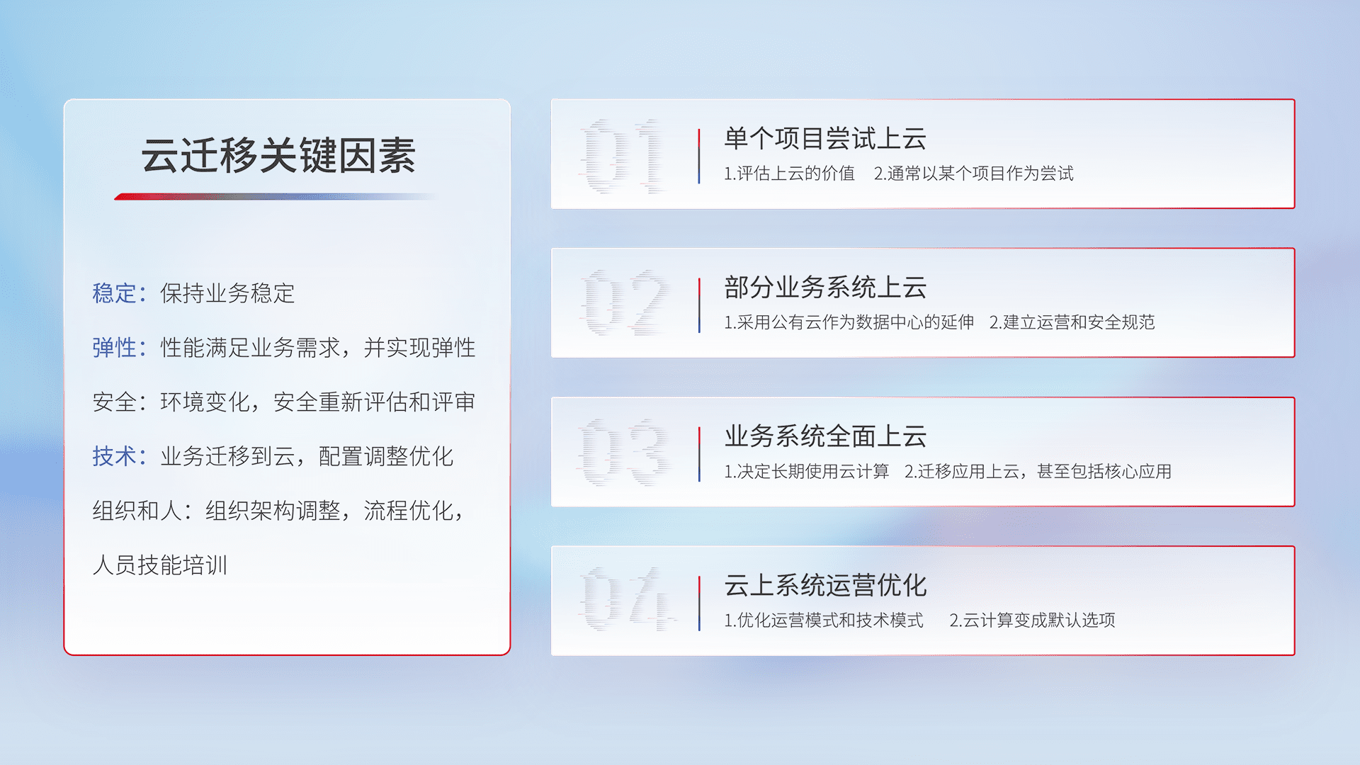 结合实际业务,,,,从规划设计、、、云平台选型、、云原生改造、、、、数据迁移、、、集成交付,,,,迁移全过程为客户识别最佳上云路径,,,,做好风险识别管理,,,设计网络架构、、身份权限、、、安全审计合规、、操作审计、、、日志审计、、、、监控告警策略、、多站点容灾设计等,,对云上基础设施进行整体规划,,提升IT治理水平,,,,以满足弹性、、、、高可用、、、、高性能的需求。。