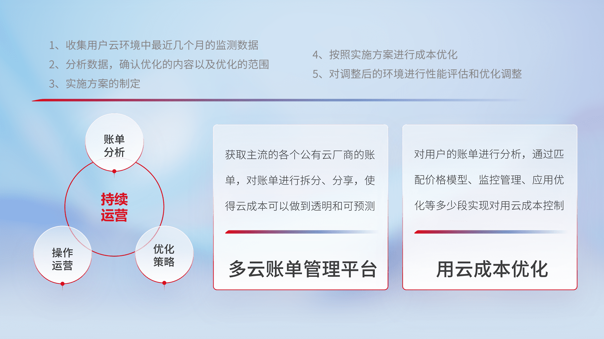 通过多云纳管,,,,以统一的资源数据模型把客户的云资源进行抽象和封装,,进而实现对多云资源的统一操作,,,,保障云资源管理的可靠性、、稳定性与可用性。。。量身定制化运维内容,,配置、、开发运维、、补丁管理、、、、备份、、、、监控、、认证和访问管理、、审计和日常巡检等,,,,保障在用云过程中的可靠度,,,,稳定度以及高可用率。。。。
